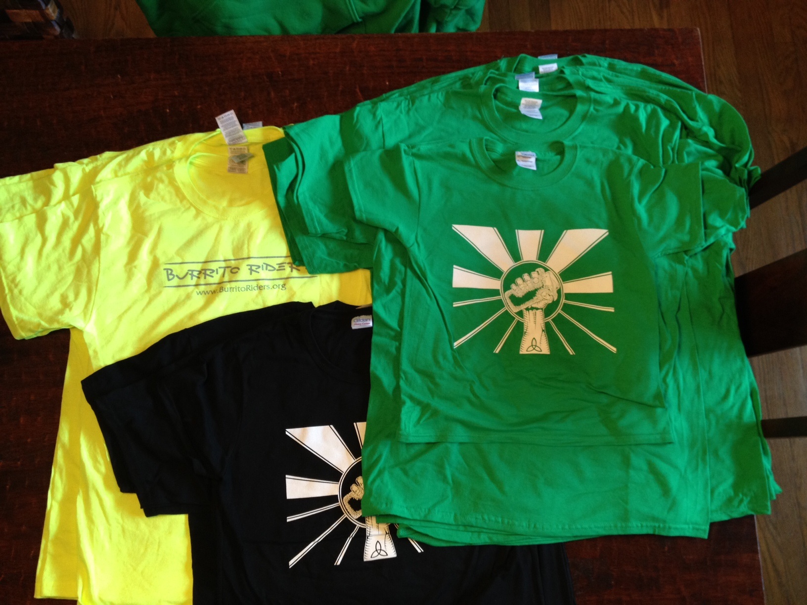 Here’s what we’ve got available. Our “standard-issue” Burrito Rider green in unisex L and XL, our “Rode Crew” (safety green with reflective silver ink) in unisex M and L, and standard issue BR green hooded sweatshirts in L and XL. Oh, and one Youth S BR green t-shirt for the tiniest rider in your life. Standard-issue: $10, Rode Crew: $12, and sweatshirts: $17. Let me know if you would like to snatch one up, very limited supply.