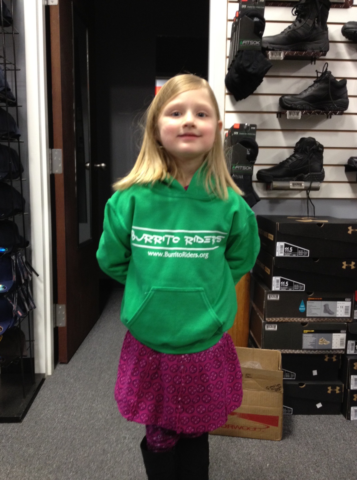This is Brennan, one of our inspirations for all of this Burrito Riders stuff we do. It was so adorable how excited she was to get her own BR sweatshirt, she wouldn’t let me leave the print shop without opening the box and letting her don hers. She’s a cutie-pie, and she’s flying the flag. So can you!